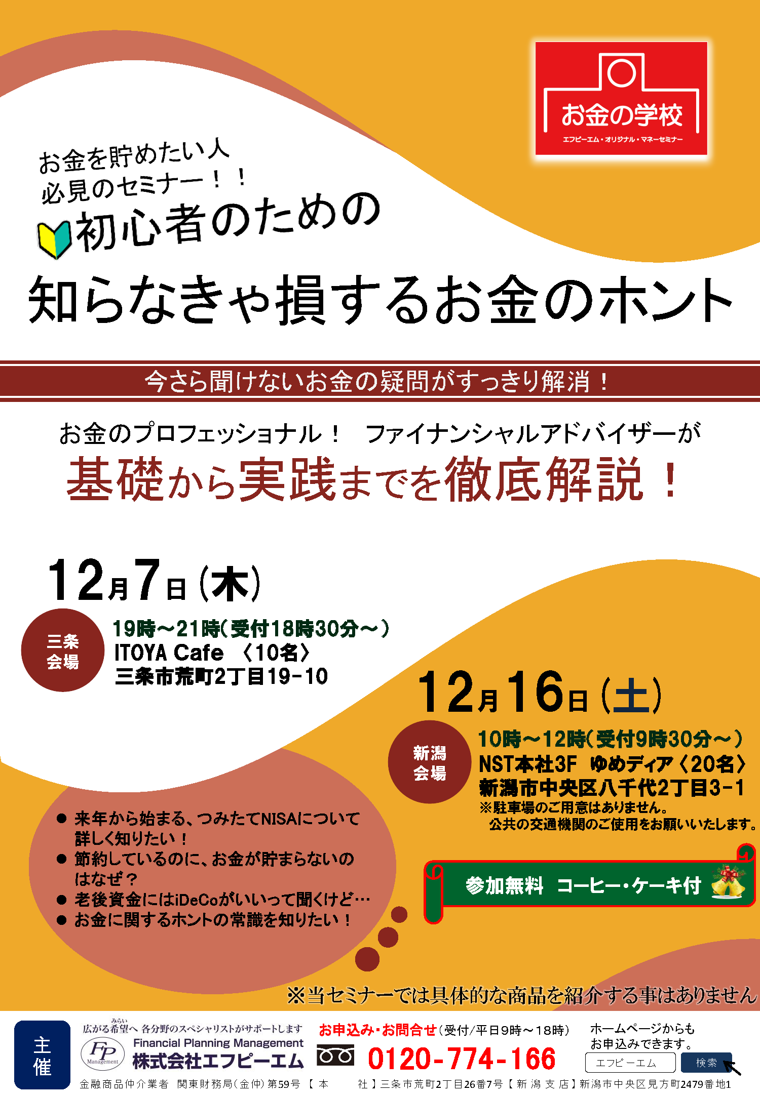 12月7日三条・12月16日新潟開催「初心者のためのマネーセミナー」 2017.10.18 お知らせ 申込みフォーム [このセミナーは終了いたしました] アクセスマップ 三条会場:ITOYA Cafe 新潟会場:NST 本社 3F ゆめディア 前の記事 一覧へ戻る 次の記事