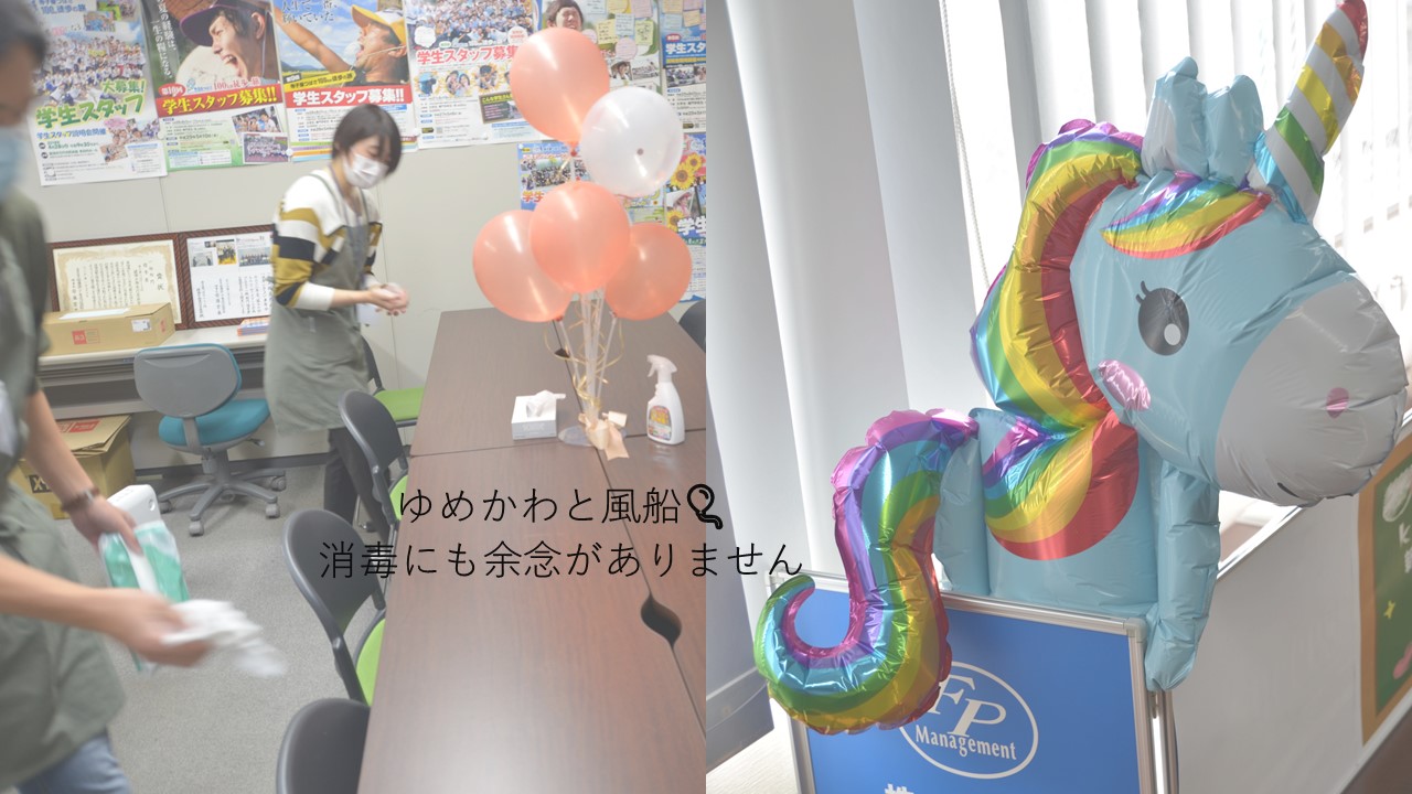普段は会議に使用する殺風景でかたい空気が漂うセミナールームを何とか子供たちに楽しんでもらえるようにとバルーンなどで飾り付けしました。