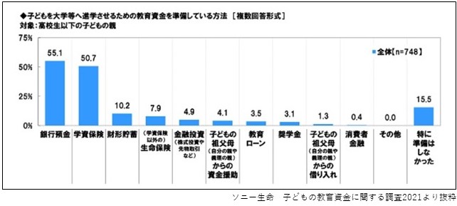 下の表はソニー生命が行った『子どもの教育資金に関する調査2021』の中から、高校生以下の子どもがいる親748人に教育資金の準備方法を調査した結果をまとめたものです。