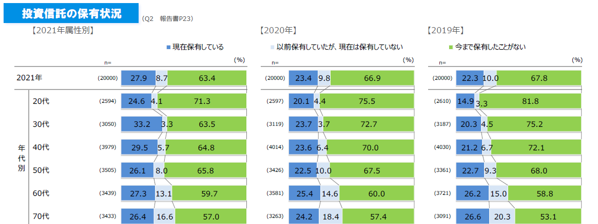 現在、投資信託を保有している人の割合は27.9%で年々増加傾向にあります。