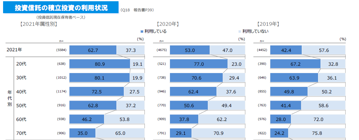 表を見ての通り、積み立て投資を利用している人は全年代で62.7%と2019年から20.3%増え、20代・30代では80%を超えています。