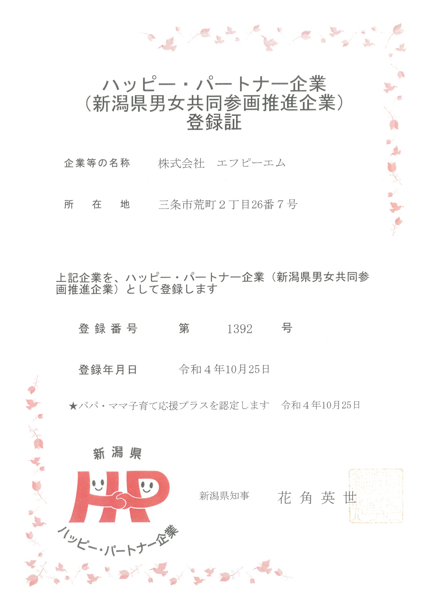 この度、エフピーエムは新潟県が取組支援している「ハッピー・パートナー企業(新潟県男女共同参画推進企業)」になりました!!